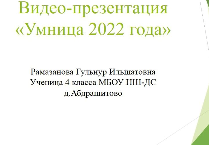 Обучающаяся 4 класса начальной школы Рамазанова Гульнур приняла активное участие в районном конкурсе " Умники и умницы-2022". Она подготовила портфолио достижений и видеоролик самопрезентации. По итогам конкурса Гульнур удостоилась диплома участника.